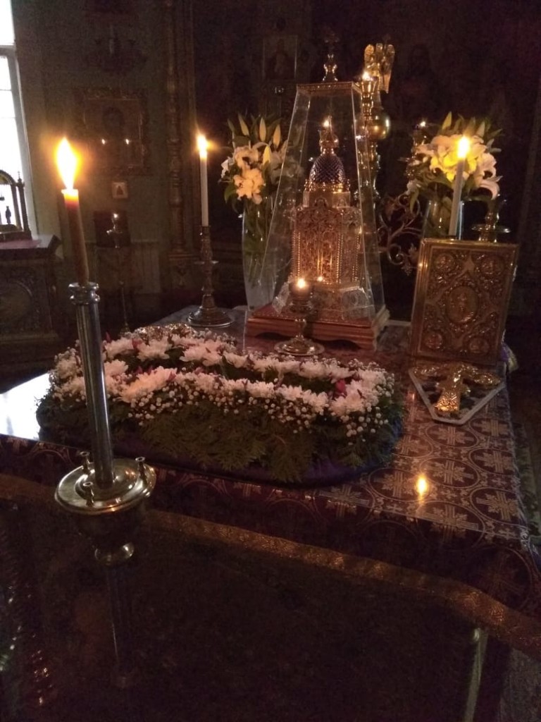 Здесь в центре храма он будет находиться всю неделю. После каждой службы будет совершается особое поклонение Кресту.