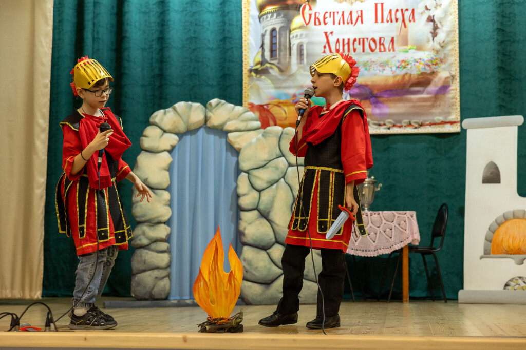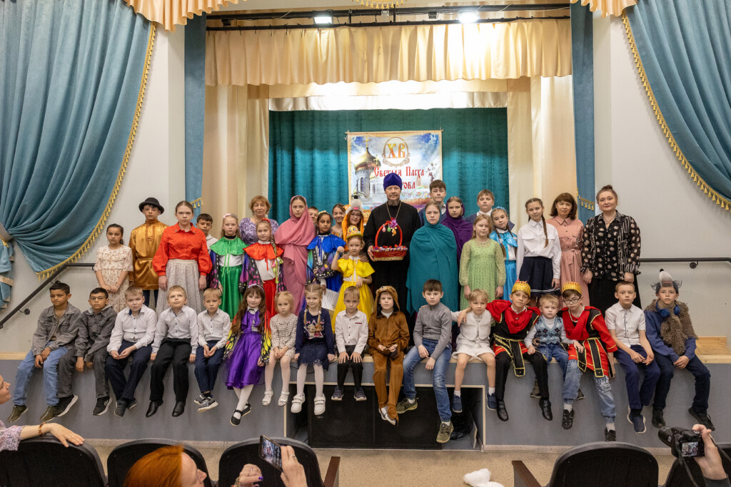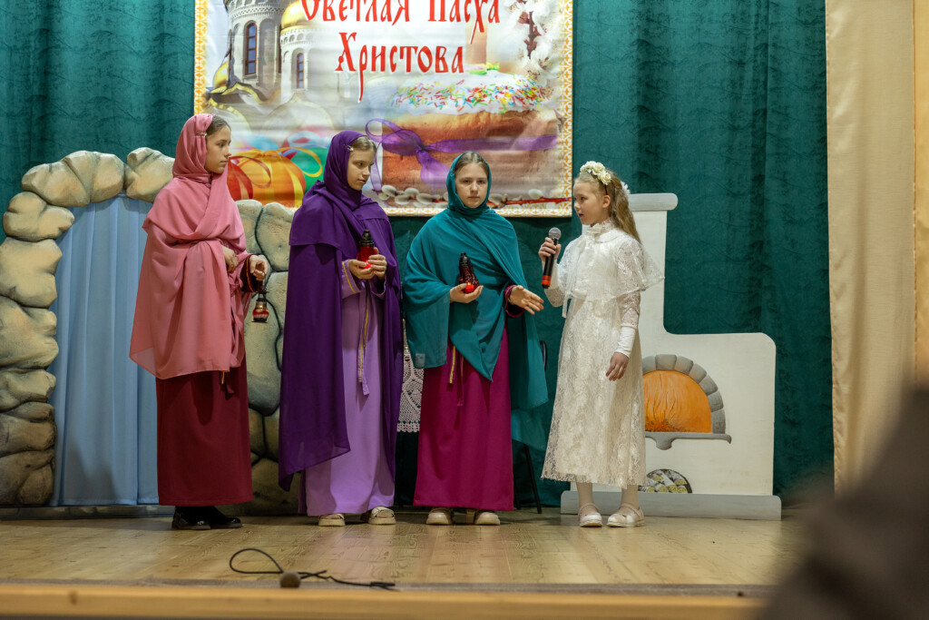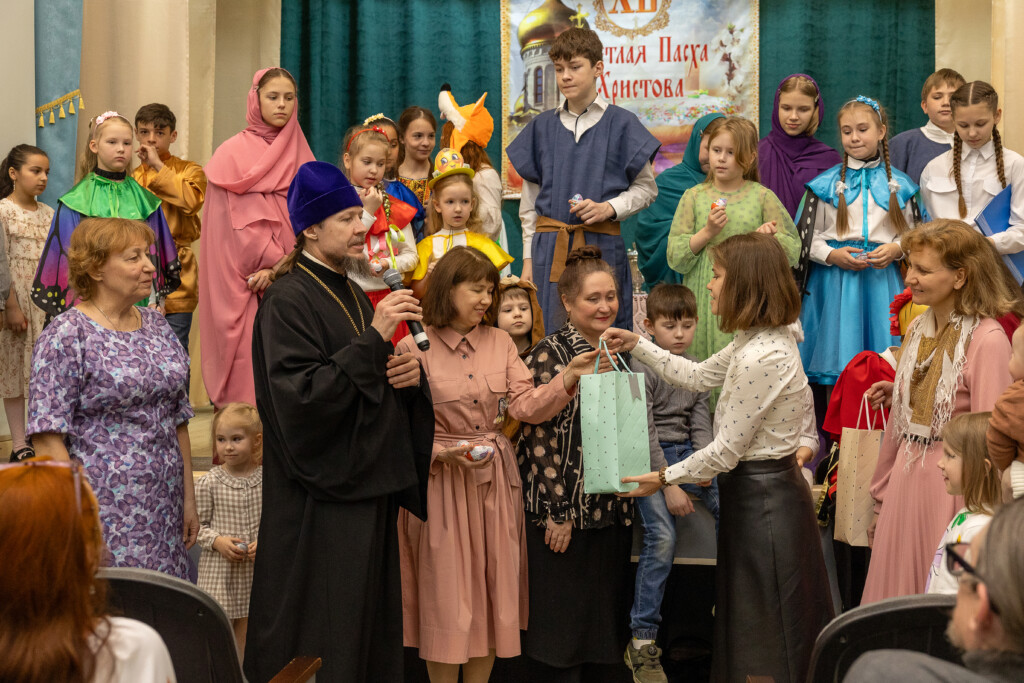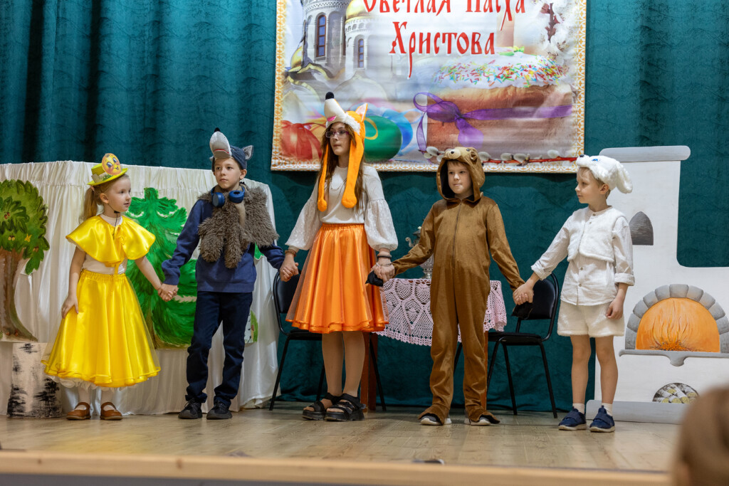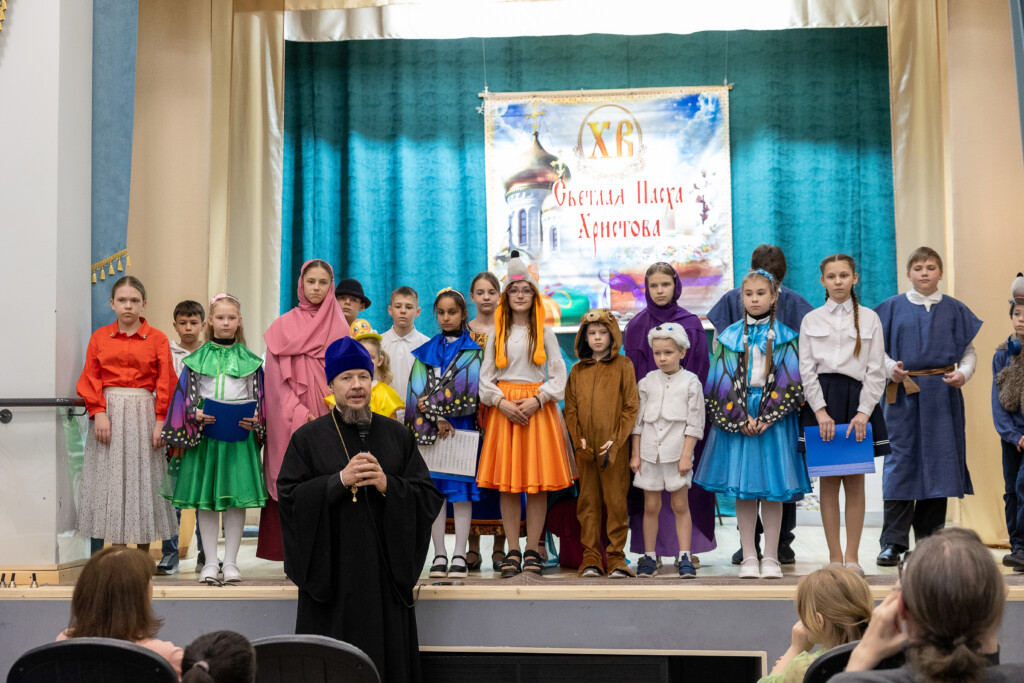 С приветственным словом к воспитанникам и их родителям обратился директор и духовник школы протоиерей Николай Архангельский. На празднике звучали пасхальные песни и стихи, прославляющие воскресшего Господа Иисуса Христа. Под руководством педагогов, учащимися воскресной школы, был поставлен спектакль «Пасхальный колобок» и сцена из жизни жен мироносиц, которые представили вниманию родителей и прихожан.
